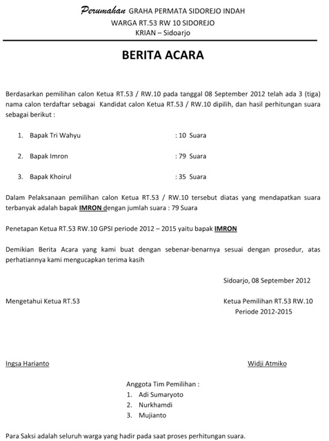 Surat Berita Acara Pemilihan Rt. / Contoh Berita Acara Pemilihan Ketua Rt - Shoe Susu. Pada hari ini jum'at malam sabtu tanggal 23 bulan januari tahun dua ribu lima belas, panitia pemilihan ketua rt melaksanakan pemungutan suara pemilihan ketua rt pemekaran rt. Surat berita acara kehilangan ini dibuat pada hari senin, tanggal sembilan belas oktober , tahun 1. Surat pemberitahuan adalah sebuah surat yang berisi informasi dan memiliki kegunaan untuk menyampaikan informasi tersebut dari si penulis biasanya, surat ini berisi tentang kegiatan atau acara yang akan hadir dalam waktu dekat. Acara pemilihan ketua rt.007/08 kel. Saya menjalaninya setiap subuh kebetulan bulan puasa sambil selepas s.